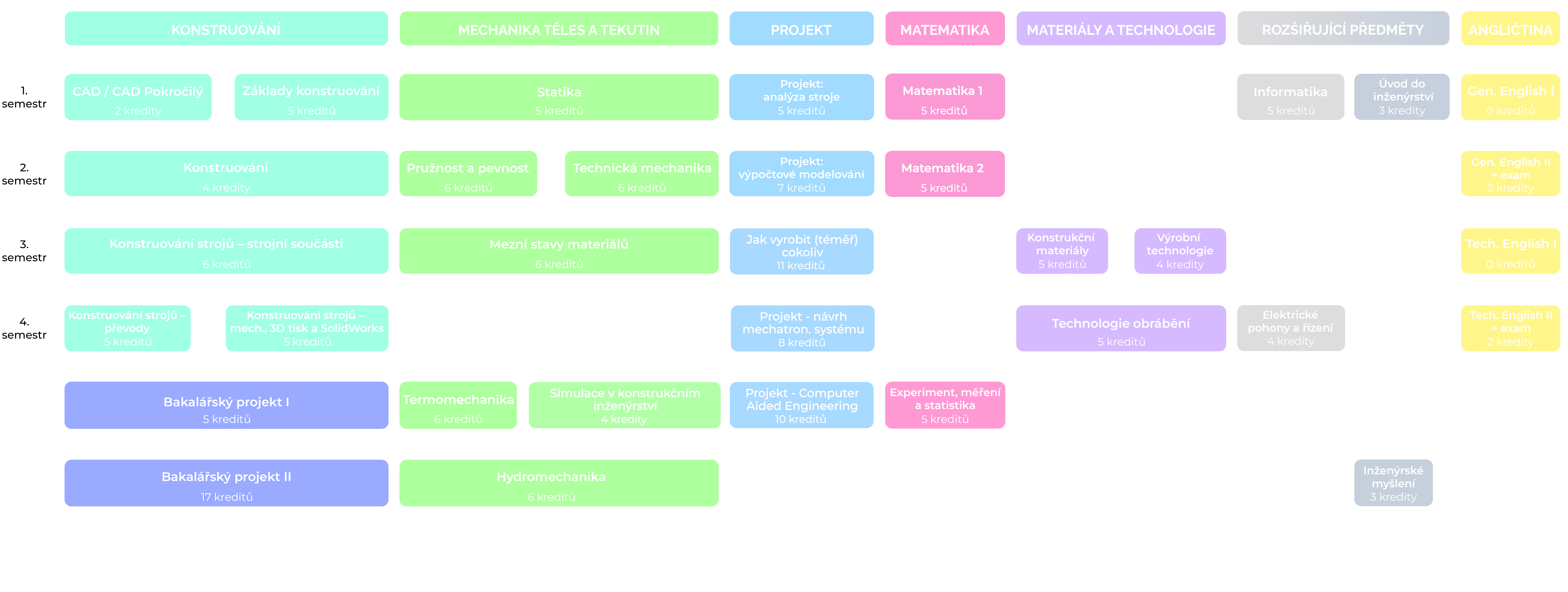 Vyučované předměty jsou rozděleny do čtyř základních oblastí, kterými jsou konstruování, mechanika těles a tekutin, materiály a technologie a matematika. Součástí studijního plánu jsou také rozšiřující předměty a angličtina. Samostatnou kategorii představují projektové předměty, které jsou v každém semestru tematicky navázány na teoretické předměty a učí tak studenty aplikovat získané znalosti při řešení reálných problémů. Významný prostor je věnován bakalářské práci, kde mají studenti díky značné hodinové dotaci jedinečnou šanci ukázat, že už v rámci prvního stupně studia získali znalosti a dovednosti, které jsou tím nejlepším předpokladem nejen pro navazující studium, ale i tvůrčí a profesní činnost.